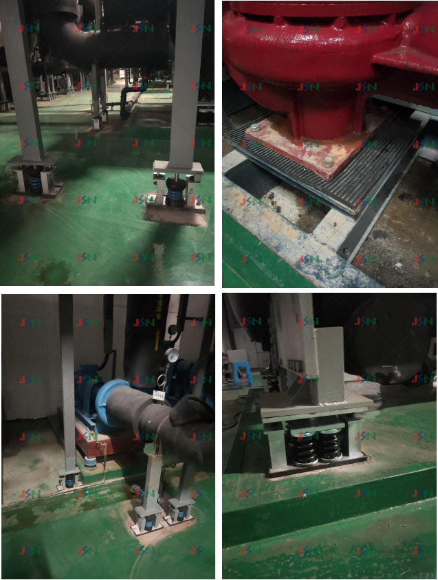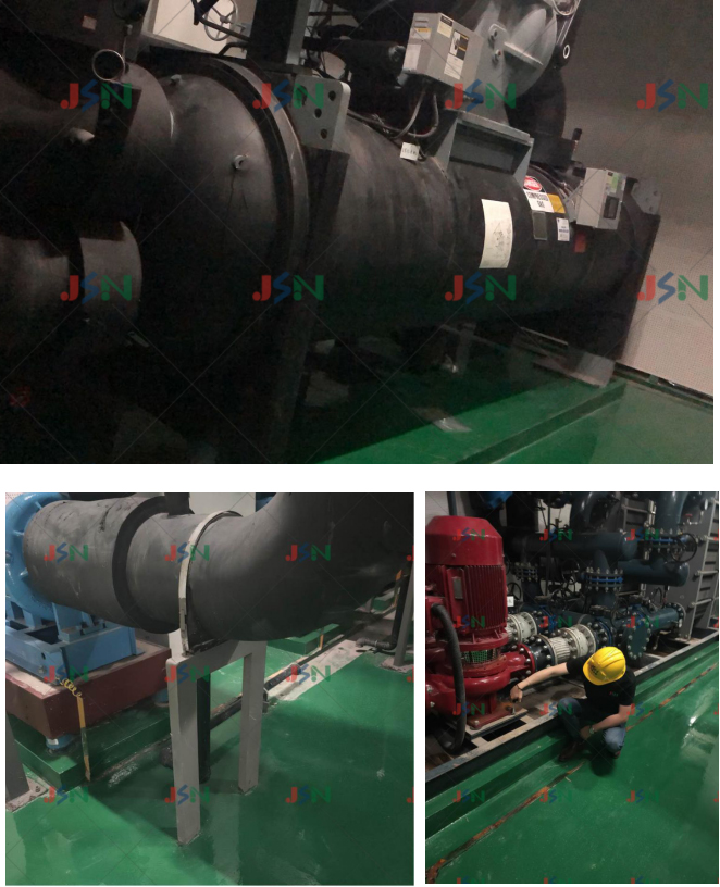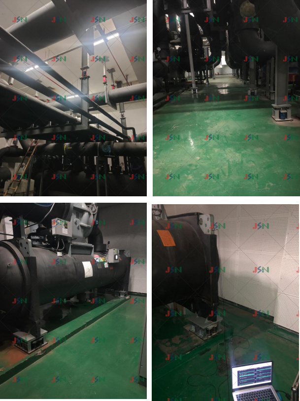 案例簡介:項目現場為工商銀行浙江分行總部大樓,采用框架結構,設備在大廈負一樓有2臺離心式冷水機組、3臺立式水泵機組、 1臺螺桿壓縮機組及有6臺循環水泵相連管道。設備運行在樓上大廳有嚴重的低頻噪音及振感。